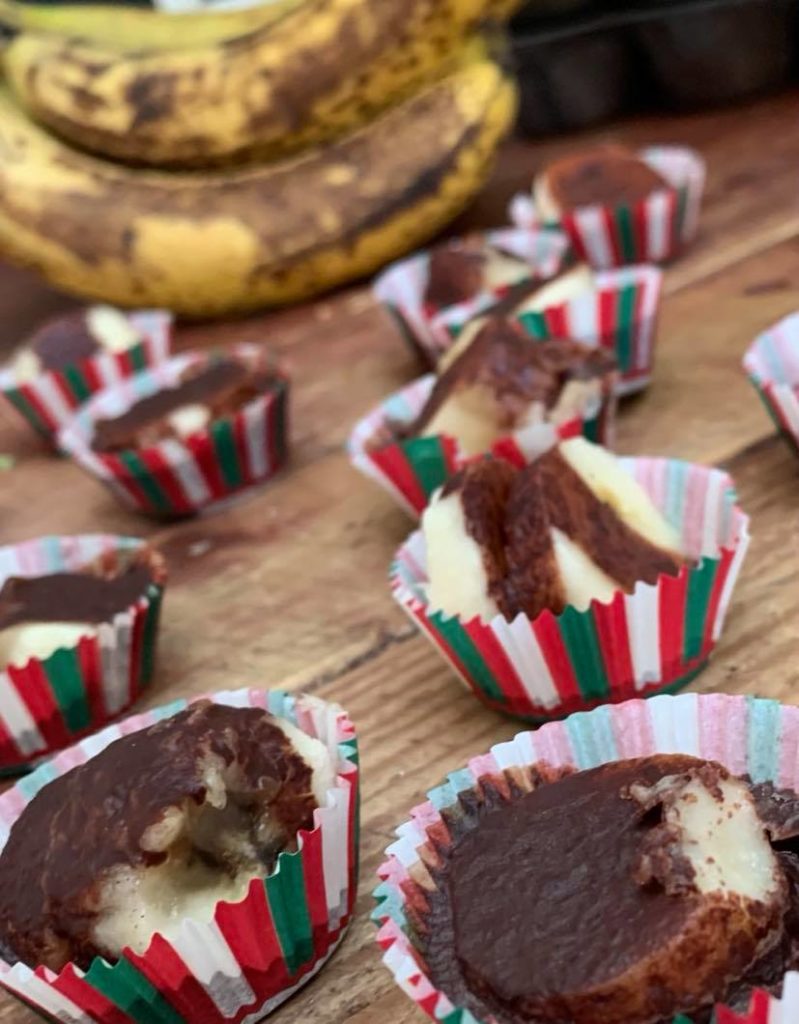 I added ripe bananas into muffin cups. Then drizzled magic mix on top set them in the freezer for our afternoon snack. Enjoy!